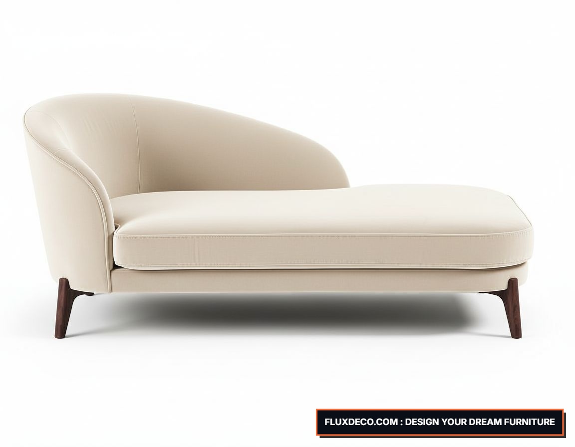 This stunning modern chaise lounge showcases a luxurious cream velvet upholstery that exudes comfort and elegance. The smooth, curved design creates a seamless and inviting silhouette, perfect for both lounging and aesthetic appeal. The dark walnut wood legs provide a sturdy foundation while adding a touch of warmth and contrast to the overall look. The AI-generated design ensures a perfect balance of form and function, making it an ideal addition to any modern living room or relaxation space. The combination of soft velvet and rich wood creates a sophisticated ambiance, elevating the decor of any home interior.