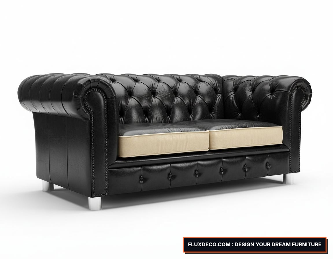 This stunning luxury Chesterfield sofa reimagines classic design with contemporary sophistication. The deep, plush jet black premium leather upholstery creates a bold focal point, while the contrasting cream velvet fabric accents on the seat cushions add a touch of refined elegance. The meticulously tufted backrest and rolled armrests embody timeless Chesterfield craftsmanship, enhanced by polished chrome metal legs that elevate the piece with modern flair. Perfect for creating an inviting yet stylish atmosphere in living rooms, upscale lounges, or home theaters, this sofa combines comfort with architectural beauty. The AI-generated design ensures a perfect balance of traditional charm and contemporary aesthetics, making it an ideal centerpiece for sophisticated interiors.